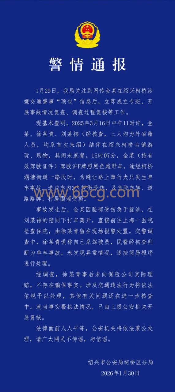 近日,“金晨被曝疑似涉嫌交通肇事逃逸”事件引发广泛关注。1月30日,绍兴市公安局柯桥区分局发布警情通报。